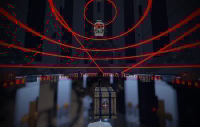 - Go to the top of the Arena, climb up the legs of the building. At the top you will find three red card readers. These card readers are numbered 1 to 3, insert your red cards to activate the red button.