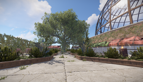 In the park area there are Food boxes, benches, trees, plants and a swimming pool.