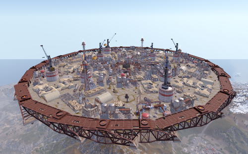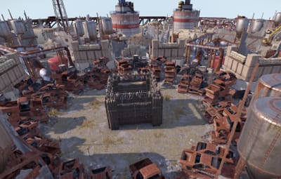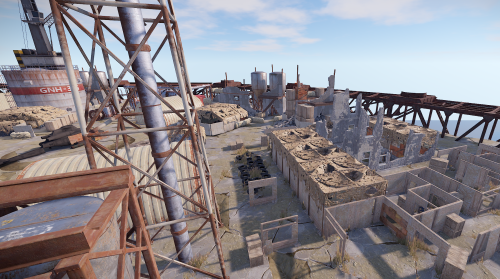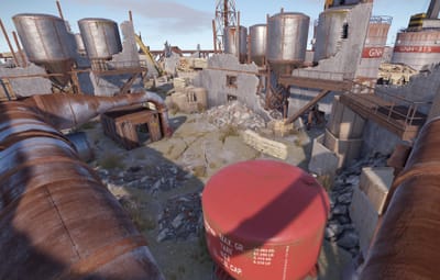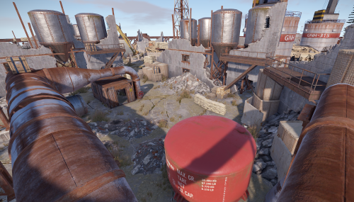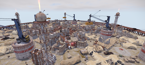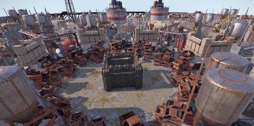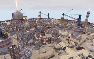 The arena is in an industrial/military wasteland setting, with ruined industrial buildings, pipelines and old military facilities. The addition of storage tanks and cranes gives additional opportunities for ranged combat.