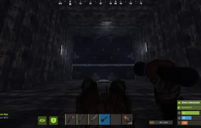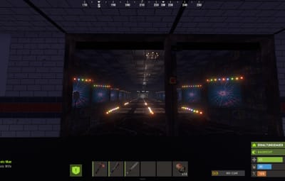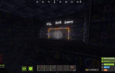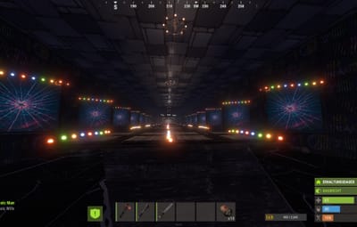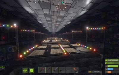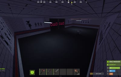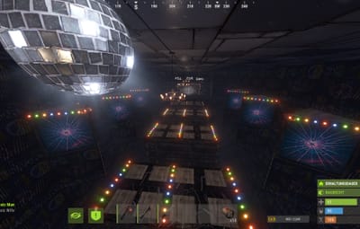 The platforms are equipped with sensors. If you step on the wrong platform, the gates on the sides containing the turrets automatically open, complete with flashing lights. There's another room like this next door. This is a 1v1 game, the first player to reach the back gets a button that opens all the turret gates on the enemy side.