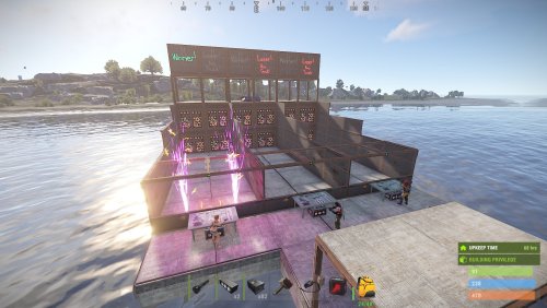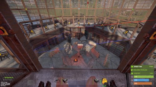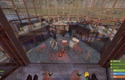 There is a little setup ahead of time, as you will need to add the weapons/kits to the lockers that you want the contestants to use, and make sure to include a bed in the locker for them to put down for respawns if you wish. Only the cells with door controllers and the clear skinned garage doors in front of the seating are locked, you will need to add any further locks you wish. Make sure to set stability to "false" in copy paste for this build, as the spiral stairs like to collapse when pasted.