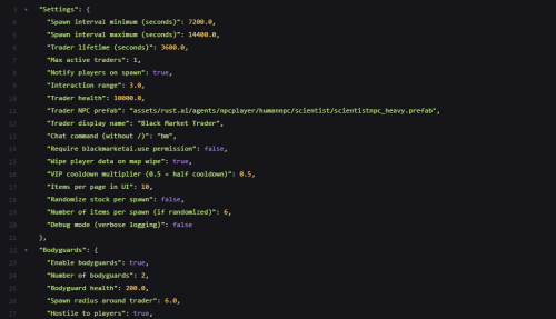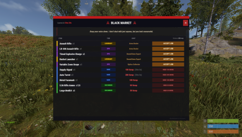 Bring a High Stake, black market trader to your server. A mysterious NPC trader spawns and broadcasts their arrival and vanishes after a configurable amount of time. Players interact with a modern CUI shop to buy limited Stock, and players can get top teir items by completing delivery style contracts to the Black market ai.