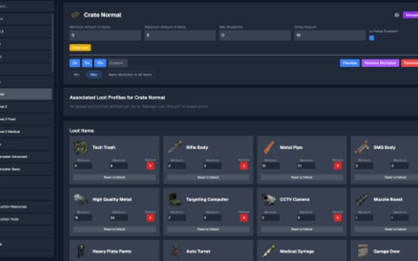This setup includes newly added items such as the Minigun, Minigun Backpack, and Military Flamethrower — ensuring your loot stays up-to-date with the latest Rust content.