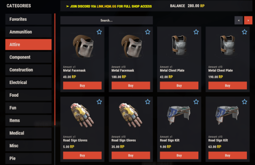 (In the Attire category, players can now choose between single or 10x quantities for items such as Facemask, Chest Plate, Kilt, Gloves, Jackets, and Boots, with reduced prices for larger purchases.)