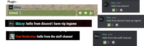 - Server Plugin - This recieves the messages from the discord bot and fetches info such as betterchat/clans data then formats and sends the 'fake message' ingame