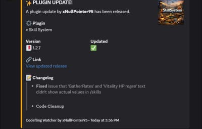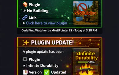 Automatically track your new plugin releases and your plugin updates on Codefling and receive Discord notifications via webhook. (Using Codefling Public DB API)
