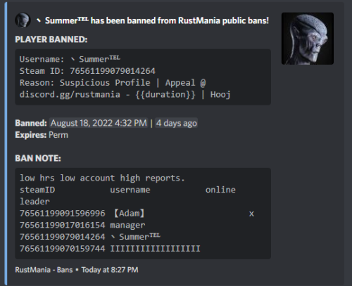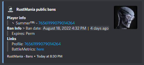 Anytime you ban someone through Battlemetrics this will announce the ban in your Discord!