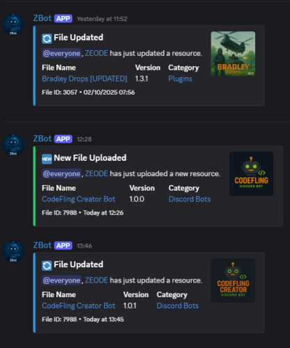 The bot monitors users specified in the config and using the CodeFling API, sends notifications to Discord for various actions: