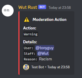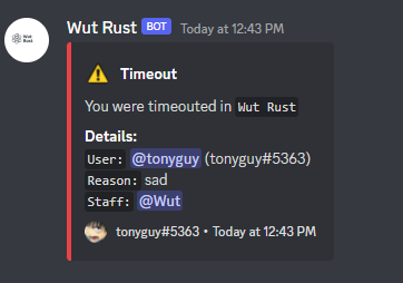 - /timeout <user> <reason> <time(10s, 10m, 10d, 10w) - Timeouts a user, + privatemessage and logging