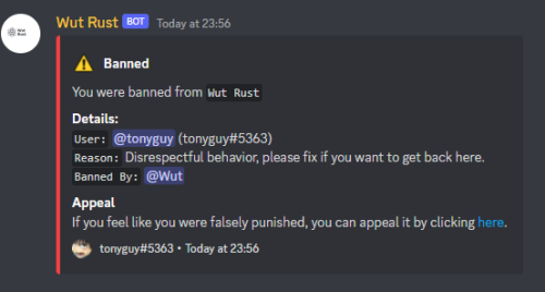 - /ban <user> <reason> - Bans the given user from the discord + logging and private message to the banned user