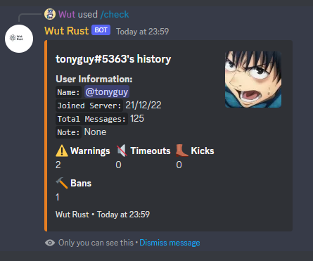- /check <user> - Sends some information on the user(wanrs, timeouts, bans, messages and jointime)