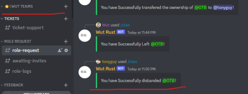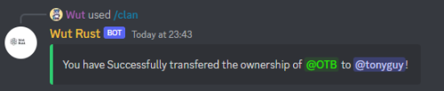 - /clan transfer <user> - Transfer the ownership of your clan to another user.