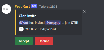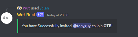 - /clan invite <user> - Invite a user to your clan. - https://imgur.com/a/Wxjk0zf