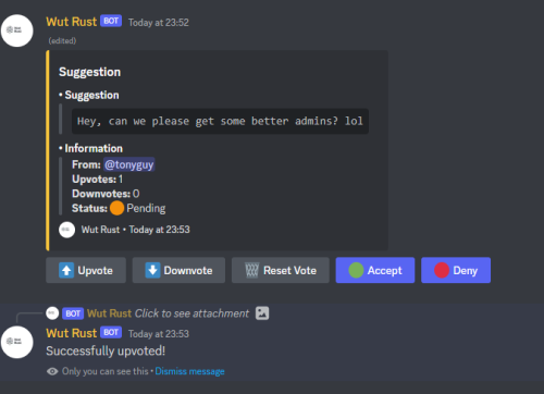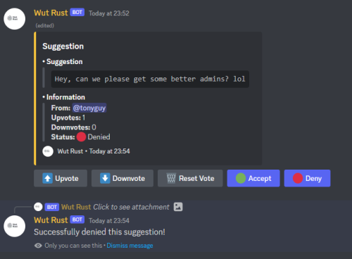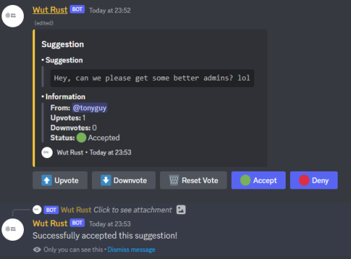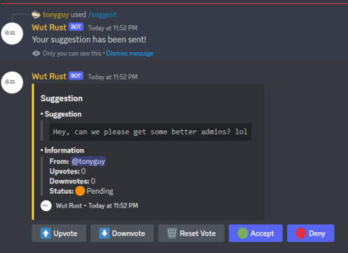 - /suggest <suggestion> - Sends a suggestion in the channel, so other users can up/downvote - Admins can decline or accept it - All Pictures: https://imgur.com/a/fyVrnEs