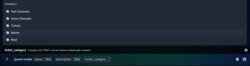 Creates a new ticket panel (ticket type) and sets which category tickets will be created in.