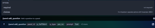 /panel add_question <panel_id> <q_type> <prompt> [required] [choices]