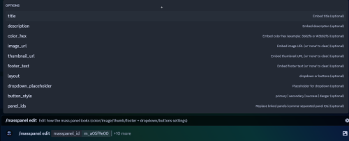 /masspanel edit <masspanel_id> [title] [description] [color_hex] [image_url] [thumbnail_url] [footer_text] [layout] [dropdown_placeholder] [button_style] [panel_ids]