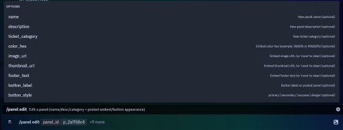 /panel edit <panel_id> [name] [description] [ticket_category] [color_hex] [image_url] [thumbnail_url] [footer_text] [button_label] [button_style]