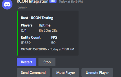 Discord RCON works by utilizing the RCON Protocol, removing the need for any plugins on the server(s). Easily view the FPS, Entity Count, Player Count on your server(s). View the plethora of logs quickly & easily and execute Commands or Actions with a few quick movements.