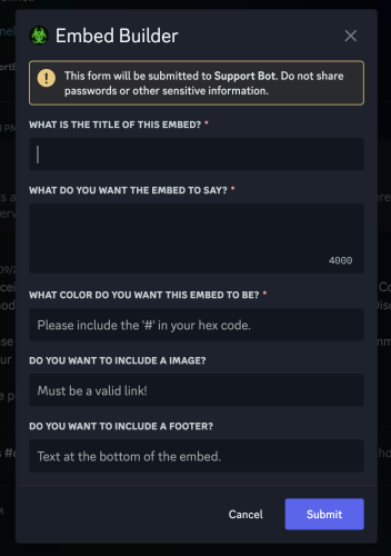 A simple bot to handle your simple discord needs. Always updating and and improving. Discord Support Bot strives to be the most in depth and customizable utility bot on the market. With plans to rival other bots that require monthly subscriptions, outrageous setup costs, or overcharging personal developers, Discord Support Bot does it all, at a cheaper price.