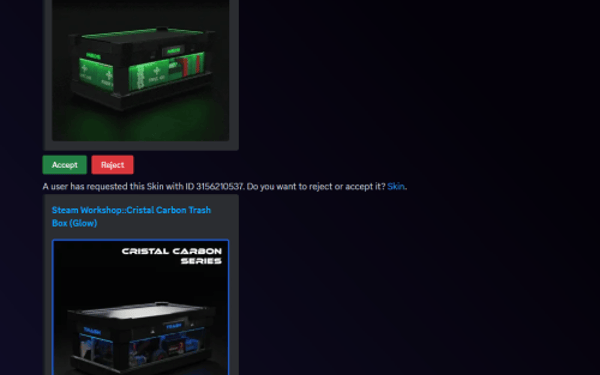 - Aprobación y Rechazo de Skins: Los miembros del equipo pueden aceptar o rechazar las solicitudes de skins. Esta función proporciona a los administradores la capacidad de gestionar las skins que se agregan al juego.