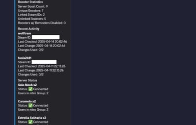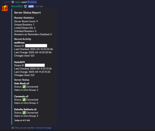 /status Shows bot status, number of players boosting, linked Steam IDs, recent actions, and server connections.