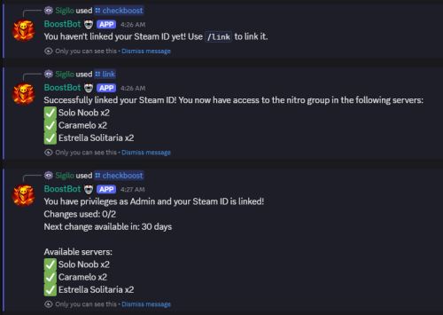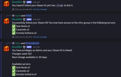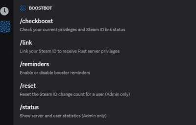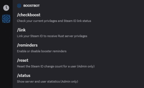 /checkboost Check your current boost status and Steam ID link. Shows your boost status, linked Steam ID, and available servers. Displays when you can next change your Steam ID.