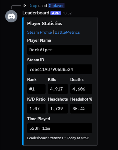This bot connects to your leaderboard website and brings player statistics directly into Discord. Just use the /player command with a Steam ID and it'll show you all the important stats in a clean, organized format.