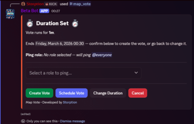 Scheduled votes — Queue a vote to start automatically at a set time. Schedules survive bot restarts, so nothing gets lost if the bot goes down.