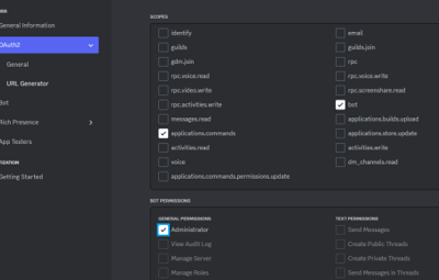 - Go to OAuth2 -> URL Generator. In Scopes select bot and applications.commands, under Permissions select Administrator