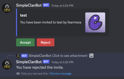 - /clan-invite {user} : PM's user with Accept/Reject buttons, will assign the user the clan role in the server (invited user must be in the server already)