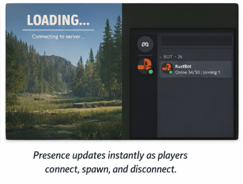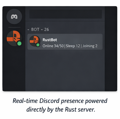 SimplePresence is a lightweight, production-ready plugin built and tested for Carbon Rust servers that updates your Discord bot’s presence in real time using direct in-server data.