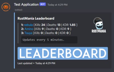 A Discord bot that shows all of your servers stats in an auto-updating leaderboard that includes stat commands that shows the specified players global rust stats, or the stats for that specific Rust server.