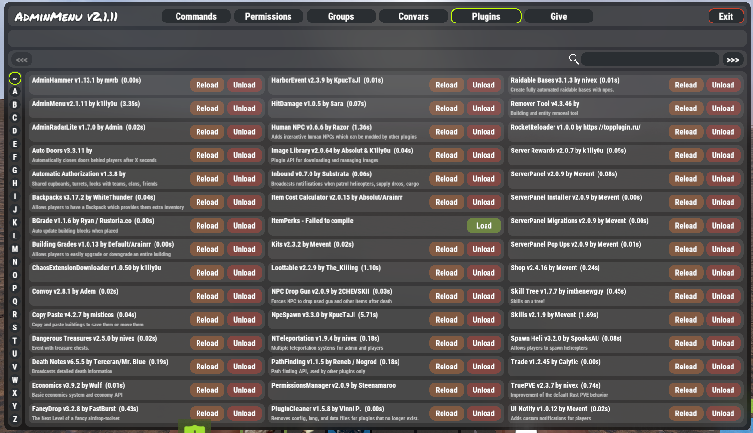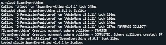 Unload plugin delete file: /oxide/data/SpawnEverything.json Reload plugin I tried the configuration and it works without any problems: