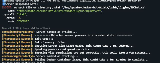 Hi my server runs oxide and has the latest version of the dedicated server and oxide. Im getting the following errors, causing players to get kicked when interacting with the animal farm. I have included my config file in case that helps at all. I am using the latest version of the plugin, 1.3.5. What can i do to fix this error? NullReferenceException: Object reference not set to an instance of an object at Item.Save (System.Boolean bIncludeContainer, System.Boolean bIncludeOwners) [0x00019] in <4a8675d0fdb04a78becadde562d78f49>:0 at ItemContainer.Save (System.Boolean bIncludeContainer) [0x0011c] in <4a8675d0fdb04a78becadde562d78f49>:0 at PlayerLoot.SendUpdate () [0x000a2] in <4a8675d0fdb04a78becadde562d78f49>:0 at PlayerLoot.SendImmediate () [0x00021] in <4a8675d0fdb04a78becadde562d78f49>:0 at StorageContainer.PlayerOpenLoot (BasePlayer player, System.String panelToOpen, System.Boolean doPositionChecks) [0x000ae] in <4a8675d0fdb04a78becadde562d78f49>:0 at StorageContainer.RPC_OpenLoot (BaseEntity+RPCMessage rpc) [0x00021] in <4a8675d0fdb04a78becadde562d78f49>:0 at StorageContainer.OnRpcMessage (BasePlayer player, System.UInt32 rpc, Network.Message msg) [0x000da] in <4a8675d0fdb04a78becadde562d78f49>:0 UnityEngine.DebugLogHandler:Internal_LogException(Exception, Object) UnityEngine.DebugLogHandler:LogException(Exception, Object) UnityEngine.Logger:LogException(Exception, Object) UnityEngine.Debug:LogException(Exception) StorageContainer:OnRpcMessage(BasePlayer, UInt32, Message) BaseEntity:SV_RPCMessage(UInt32, Message) ServerMgr:OnRPCMessage(Message) ServerMgr:OnNetworkMessage(Message) Facepunch.Network.Raknet.Server:ProcessRead(NetRead) Network.BaseNetwork:Cycle() ServerMgr:Update() NullReferenceException: Object reference not set to an instance of an object at BasePlayer.WaterFactor (WaterLevel+WaterInfo& info) [0x0004a] in <4a8675d0fdb04a78becadde562d78f49>:0 at BasePlayer.WaterFactor () [0x00000] in <4a8675d0fdb04a78becadde562d78f49>:0 at BasePlayer.IsSwimming () [0x00000] in <4a8675d0fdb04a78becadde562d78f49>:0 at Oxide.Plugins.DangerousTreasures+HumanoidBrain.TryToRoam () [0x0000d] in <421c5e075b864b328939aa5c92551e07>:0 at InvokeHandlerBase`1[T].DoTick () [0x00138] in <1cb0c1a470524bb4a513252921982d15>:0 at InvokeHandlerBase`1[T].LateUpdate () [0x0001f] in <1cb0c1a470524bb4a513252921982d15>:0 NullReferenceException: Object reference not set to an instance of an object at Item.Save (System.Boolean bIncludeContainer, System.Boolean bIncludeOwners) [0x00019] in <4a8675d0fdb04a78becadde562d78f49>:0 at ItemContainer.Save (System.Boolean bIncludeContainer) [0x0011c] in <4a8675d0fdb04a78becadde562d78f49>:0 at StorageContainer.Save (BaseNetworkable+SaveInfo info) [0x00027] in <4a8675d0fdb04a78becadde562d78f49>:0 at HitchTrough.Save (BaseNetworkable+SaveInfo info) [0x00000] in <4a8675d0fdb04a78becadde562d78f49>:0 at BaseNetworkable.ToStream (System.IO.Stream stream, BaseNetworkable+SaveInfo saveInfo) [0x00010] in <4a8675d0fdb04a78becadde562d78f49>:0 at BaseNetworkable.GetSaveCache () [0x00045] in <4a8675d0fdb04a78becadde562d78f49>:0 at SaveRestore+<WarmUpEntityCaches>d__23.MoveNext () [0x00091] in <4a8675d0fdb04a78becadde562d78f49>:0 UnityEngine.DebugLogHandler:Internal_LogException(Exception, Object) UnityEngine.DebugLogHandler:LogException(Exception, Object) UnityEngine.Logger:LogException(Exception, Object) UnityEngine.Debug:LogException(Exception) <WarmUpEntityCaches>d__23:MoveNext() UnityEngine.SetupCoroutine:InvokeMoveNext(IEnumerator, IntPtr) AnimalFarm.json