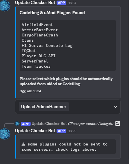 With the new update, it now updates some plugins, but on discord ice that has not been updated, but on the server console it is It doesn't work for codefling plugins, however. The bot console prints the Discord link, which allows the file to be downloaded, but nothing happens on the server.