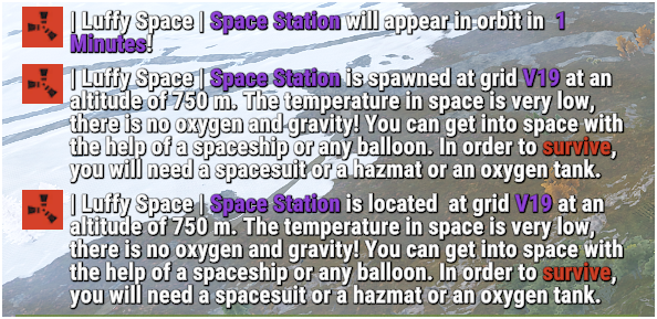 Oh.. I found what you're talking about.: If I start the event at 00:26:00 ( /spacestart - 1st message on screenshot), then with your config, the event starts to spawn at 00:27:00, in my case it fully appeared at ~00:27:45 (2nd message on screenshot), and the third message appears at ~00:28:40, because in the configuration you have set the time until the end of the event, when messages should be displayed ( 7100 ), and the total time of the event is 7200, so it turns out that two almost identical messages are played with a difference of 100 seconds. I cannot say whether this is correct or not, but I will pass this information on to Adem. "Event End Countdown Times for Chat to announce the Event Description [sec]": [ 7100, 5400, 3600, 1800 ],