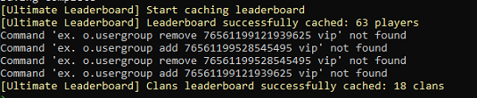 The config has example commands with "ex." prefix. Open oxide/config/UltimateLeaderboardTop.json and replace all instances of: "ex. o.usergroup add %steamid% vip" with "o.usergroup add %steamid% vip" "ex. o.usergroup remove %steamid% vip" with "o.usergroup remove %steamid% vip" The "ex." is just showing it's an example command - remove it to make the commands work.