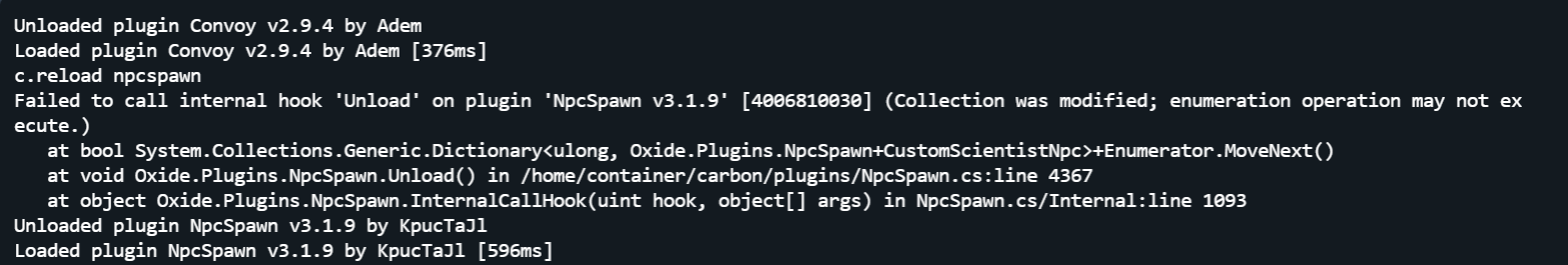 Hi! Yes, the plugins are up to date. I reloaded both to take a screenshot and received an unloading error related to NPCSpawn. However, there are no errors during plugin loading on a server restart. Not sure if it's somehow related. I checked twice yesterday, and both times everything worked correctly. However, today I tried stopping the convoy again, and all the bots suddenly disappeared right after the "getting out" animation. The counter was still showing all 9 NPCs. I checked with Admin Radar, and there were no NPCS around at all. The console was error-free. Additionally, I've received 2 more reports about despawning issues. Yesterday a sedan remained on the road after the event ended and today the same thing happened with Bradley. -
