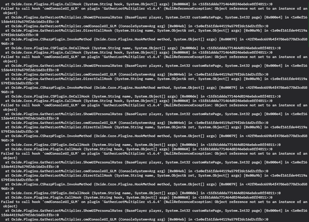 Wiped the server. Its a test server, so its slow. Still getting the same error. Will send you our Config file via DM. Timer of 300s has failed in 'Bounty Hunter v2.0.5 by Wrecks' [callback] (Object reference not set to an instance of an object) Timer of 300s has failed in 'Bounty Hunter v2.0.5 by Wrecks' [callback] (Object reference not set to an instance of an object) at void Oxide.Plugins.BountyHunter.SetupBounty(ScientistNPC b, BountyTiers tier, string monumentName) in /home/amp/.ampdata/instances/UnderDevelopment01/rust/258550/carbon/plugins/BountyHunter.cs:line 1668 at void Oxide.Plugins.BountyHunter.SpawnBounty() in /home/amp/.ampdata/instances/UnderDevelopment01/rust/258550/carbon/plugins/BountyHunter.cs:line 1636 at Timer Oxide.Plugins.Timers.Every(float time, Action action)+() => { } in /home/runner/work/Carbon/Carbon/Carbon.Core/Carbon.Components/Carbon.Common/src/Oxide/Libraries/Timer.cs:line 86 at void Oxide.Plugins.BountyHunter.SetupBounty(ScientistNPC b, BountyTiers tier, string monumentName) in /home/amp/.ampdata/instances/UnderDevelopment01/rust/258550/carbon/plugins/BountyHunter.cs:line 1668 at void Oxide.Plugins.BountyHunter.SpawnBounty() in /home/amp/.ampdata/instances/UnderDevelopment01/rust/258550/carbon/plugins/BountyHunter.cs:line 1636 at Timer Oxide.Plugins.Timers.Every(float time, Action action)+() => { } in /home/runner/work/Carbon/Carbon/Carbon.Core/Carbon.Components/Carbon.Common/src/Oxide/Libraries/Timer.cs:line 86 ```