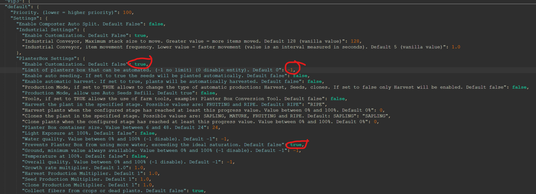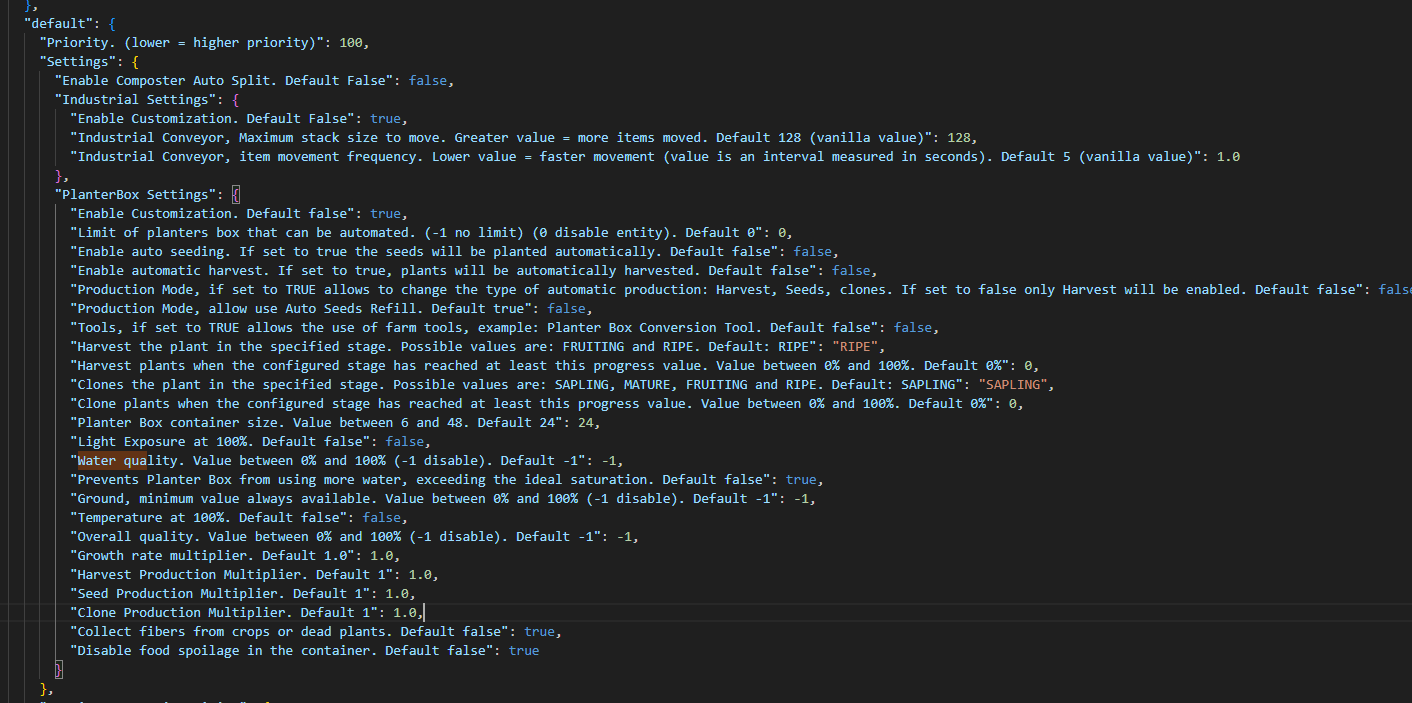 The screenshot i sent was with updated values in config. Removed plants and added new plants now, the waterlevel automaticly got reduced down from 9000/9000 down to ideal level. Seems to be working fine now.... Thanks mate. FINAL question (I promise) "Industrial Settings": { "Enable Customization. Default False": true, "Industrial Conveyor, Maximum stack size to move. Greater value = more items moved. Default 128 (vanilla value)": 128, "Industrial Conveyor, item movement frequency. Lower value = faster movement (value is an interval measured in seconds). Default 5 (vanilla value)": 1.0 Maximum stack size...... is there any limitations on this? Can i for example set 10k? On my server i got stacksizes all from 25 to 500k