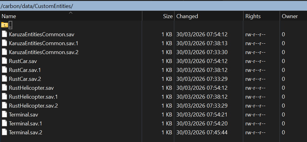 Hello, I've installed all the dependencies but still when I place the Terminal I only get a wb3 [Custom Entities] Loading savefile from "/home/container/carbon/data/CustomEntities/Terminal.sav"... [Custom Entities] INFO: The savefile "/home/container/carbon/data/CustomEntities/Terminal.sav" contains no entities, nothing to load. Any idea why?