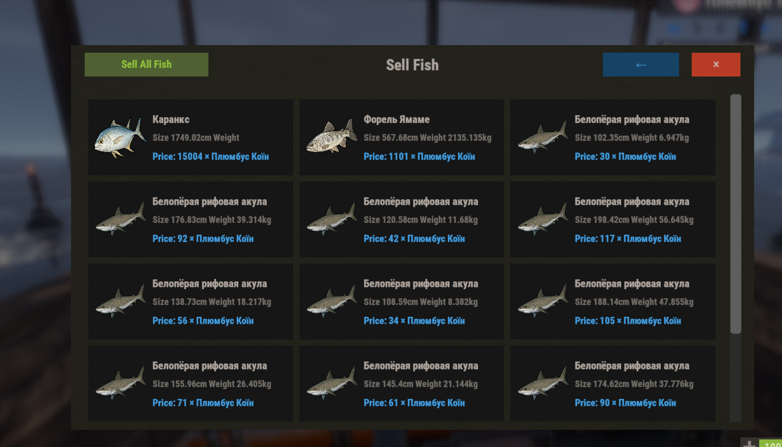 I have a question I'd like you to verify. Please change the language setting from Russian to English and then open the screen to sell fish. Does the selling price change as a result?