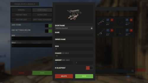 To apply a loot table to a specific object, simply enter its name in the object’s config under the “LootManager Preset” field of the plugin that spawns it.