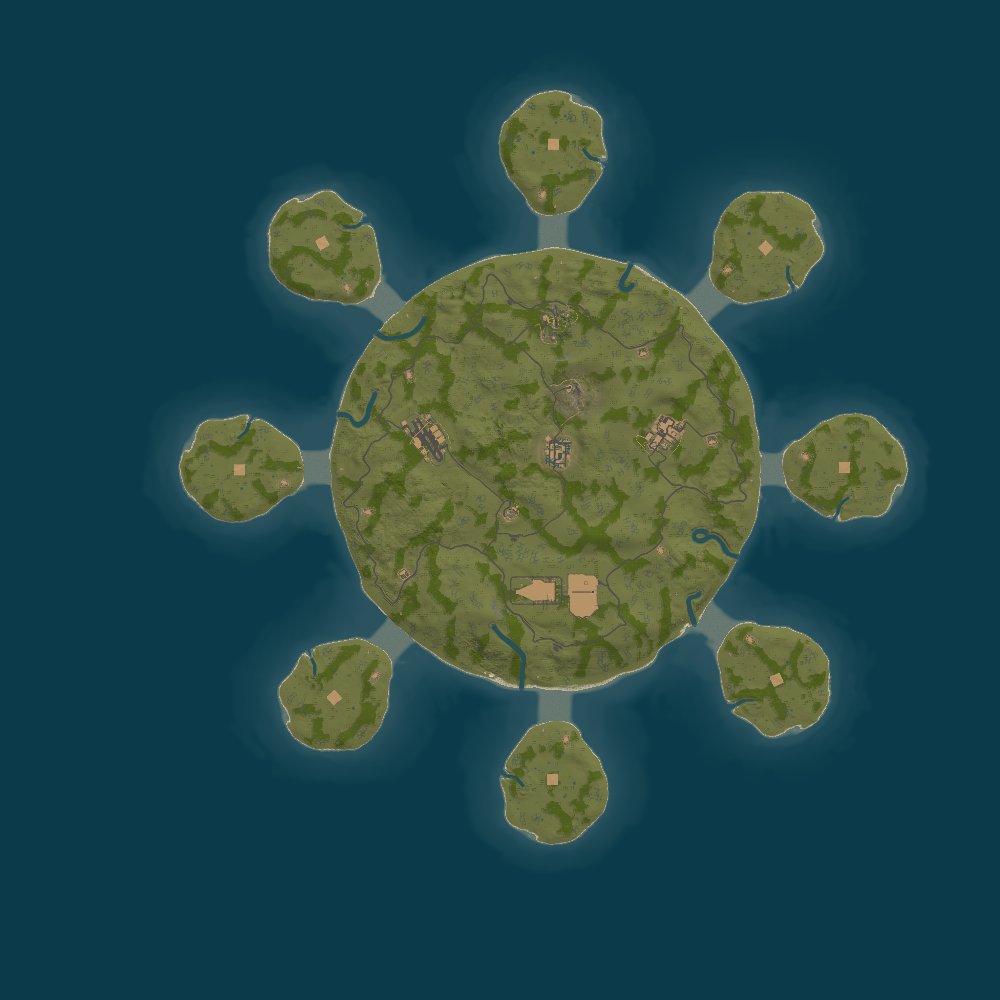 Keep your players entertained, 8 symmetric islands and a main island where players must cross to get their resources.