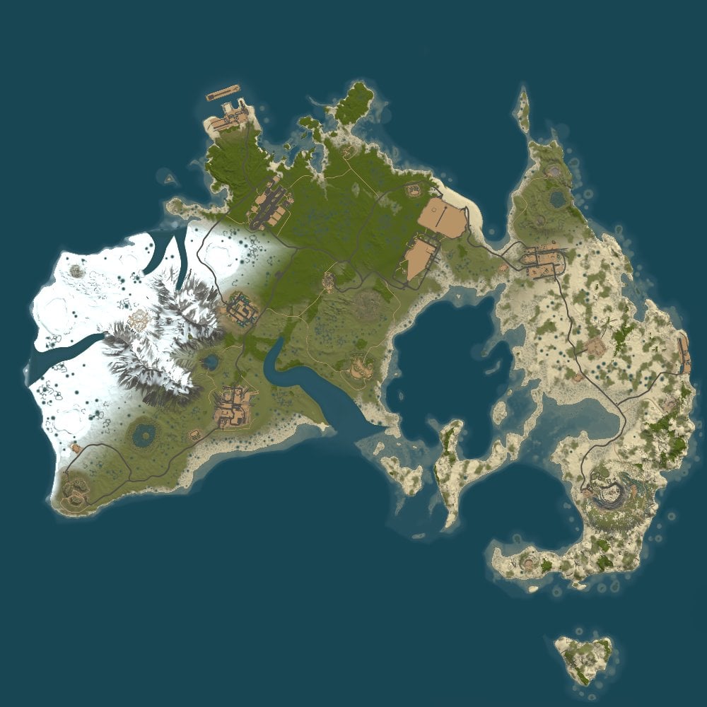 Australia Custom Map was made after the shape of Australia for a friend of mine and we decided to make it public , it has procedural monuments spread across the map and few additions on the roadside including a hidden cave in the mountains with an easter egg from Game of thrones season 8 , the cave in the mountain has zombie spawns and a locked crate inside . Cave is locked behind a blue and red key card puzzle.