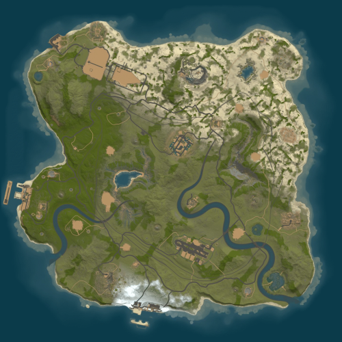 Launch Site • Military Base • Nuclear Missile Silo • Airfield • Large Harbor • Outpost • Excavator • Large Oil Rig • Small Oil Rig • Small Harbor • Dome Sphere Tank • Satellite Dish • Ferry Terminal • Sewer Branch • SuperMarket • Gas Station • Warehouse • 2x Lighthouse • HQM Quarry • Sulfur Quarry • Stone Quarry • 3x Fishing Village.