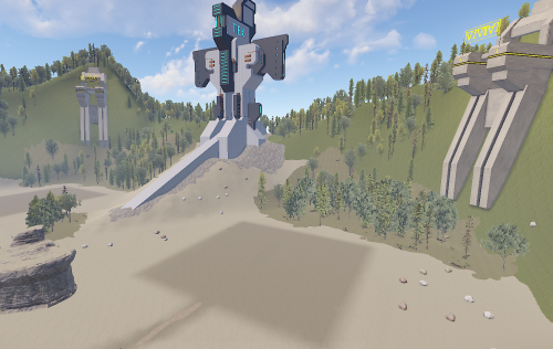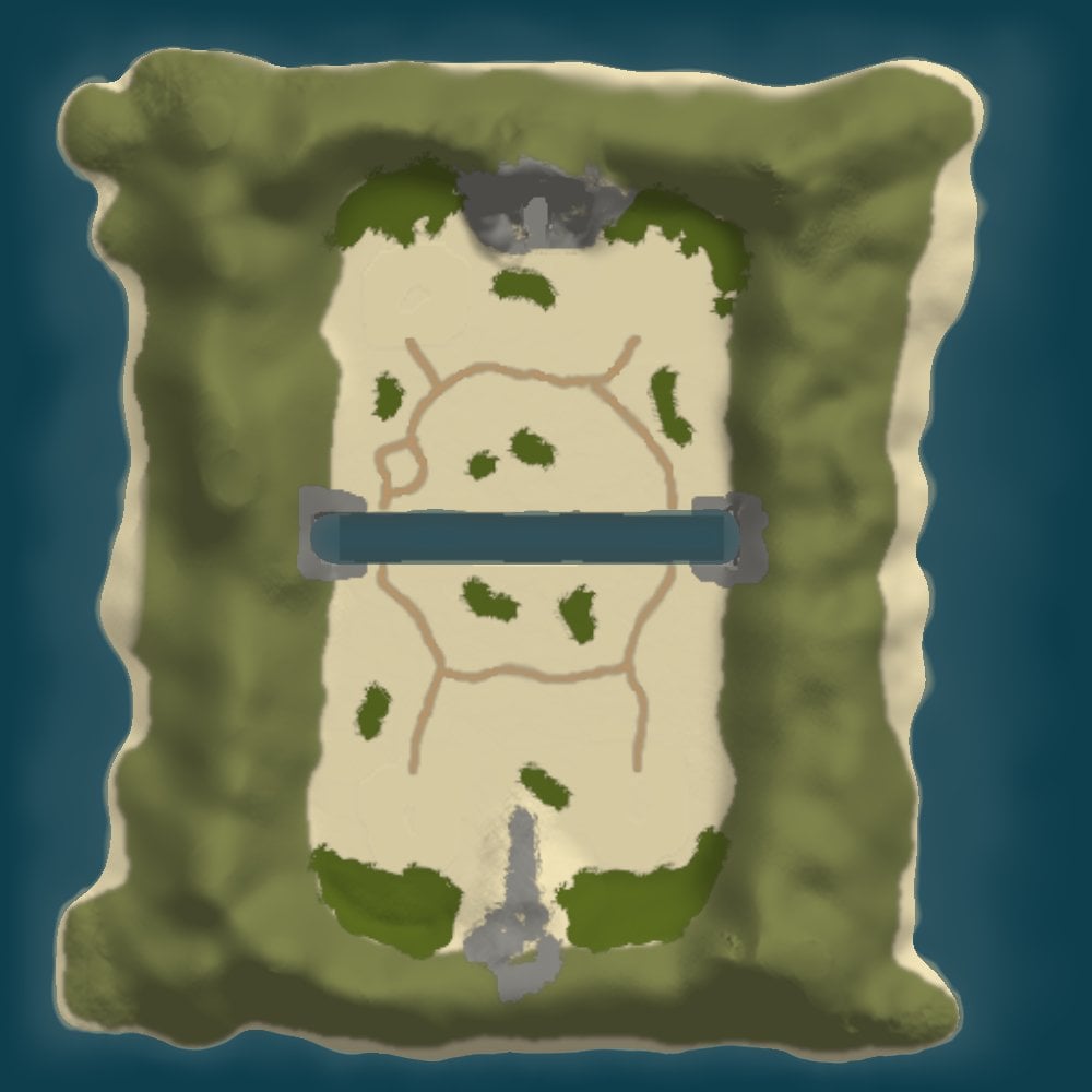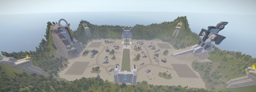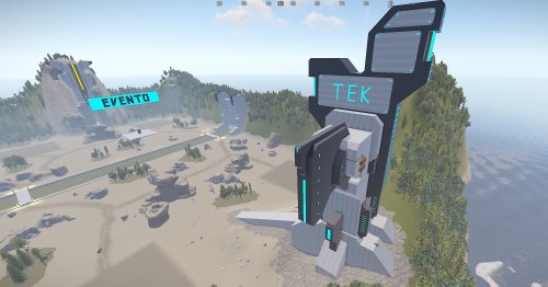 It does not have vanilla monuments since it is an arena but it does created custom structures to decorate the arena, it has a river that divides the terrain between two factions/teams, if you fall into the river you are sure to die, each zone has an assigned construction site big enough for several big teams, just start On the map there will be a spawn zone that is located in the center of the game board, once the administrators have made the teams they will have to make tp by teams to their designated zones.