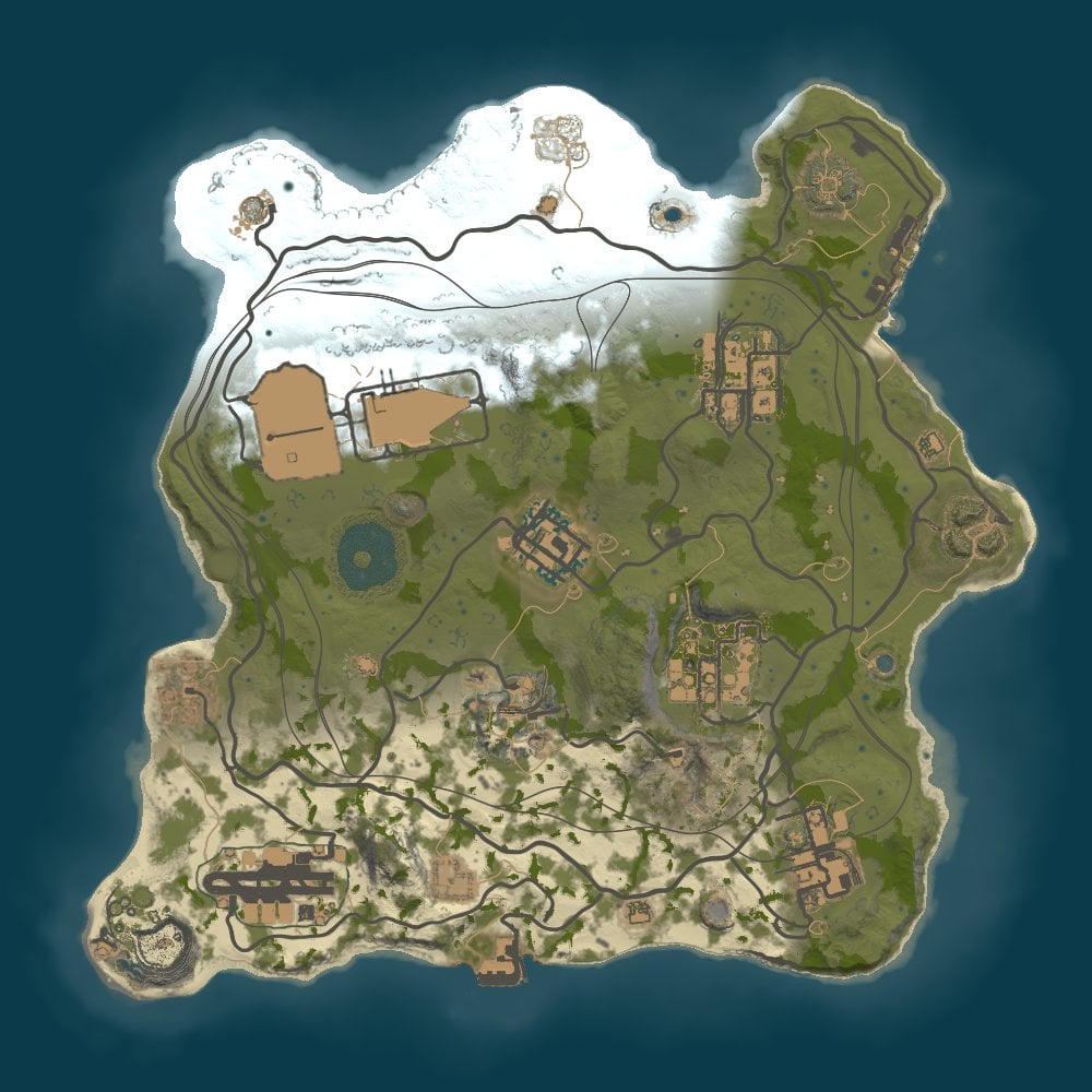 The map has all the large monuments in the game, including above-ground trains and above-ground train entrances, ring road, and every other feature you can think of that a larger map has, while still having more than enough space for building. The map is made to resemble a procedurally generated map. The only difference is that Outpost and Bandit Camp are combined.
