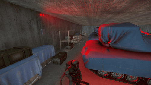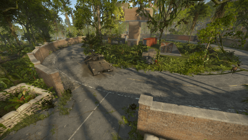 A heavily guarded military installation patrolled by a Bradley APC and hostile NPCs.